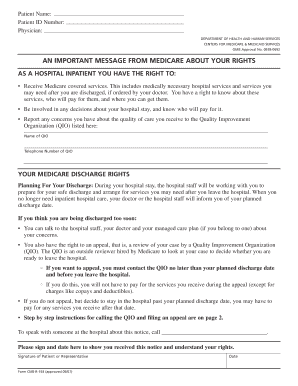 The document notifies Medicare beneficiaries of their rights Right to receive covered services Right to report quality concerns Right to appeal if they believe they are being discharged too soon. In 2006 CMS published its final rule revising the IM process requiring hospitals to deliver a revised version of the IM upon admission and if the. The IMM is a statement of patients rights and provides the beneficiary with detailed information regarding hisher discharge appeal rights.
